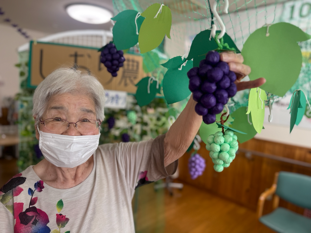 秋らしい過ごしやすい9月末日 【しおり農園】開園しました(*^^*) みずみずしい🍇ふどうに 利用者さんワクワク♪♪ デイルームが農園に大変身だー!! どの葡萄を取ろうかしらねぇ…と お話声があちらこちらから。 皆さんには 一房ずつお持ち帰り頂きました◡̈⃝︎⋆︎* 匠みスタッフによる作品ですが クオリティ高く目の保養にも なりました^^ NO作
